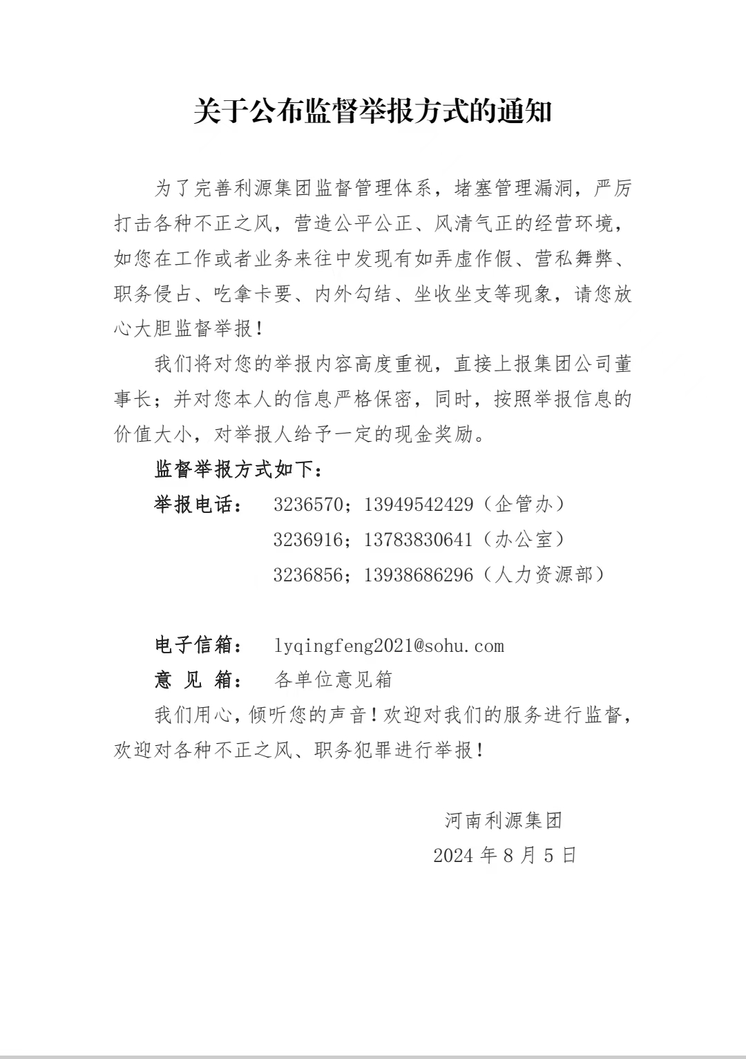 關(guān)于公布監(jiān)督舉報(bào)方式的通知